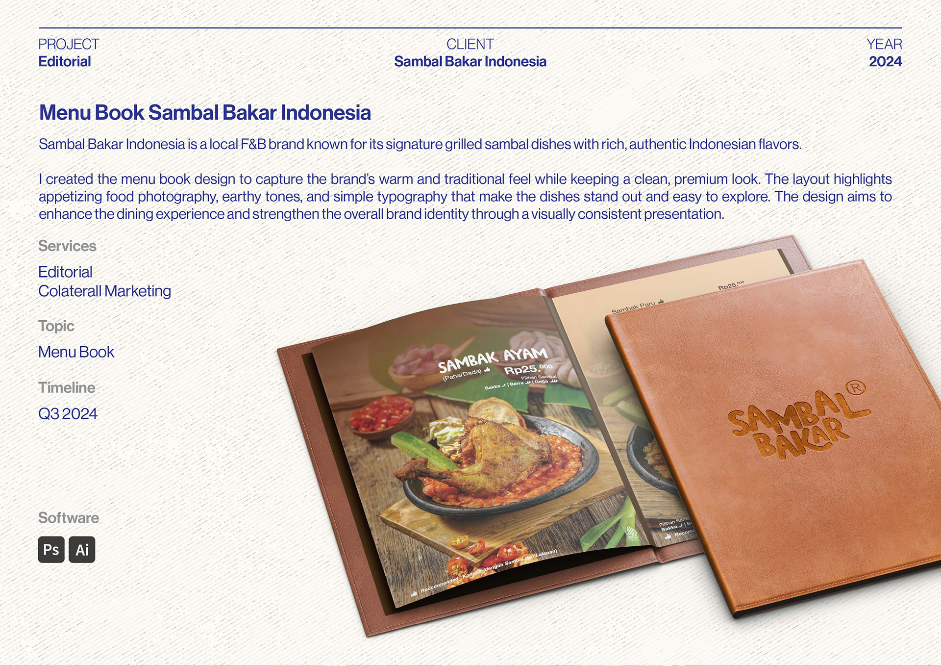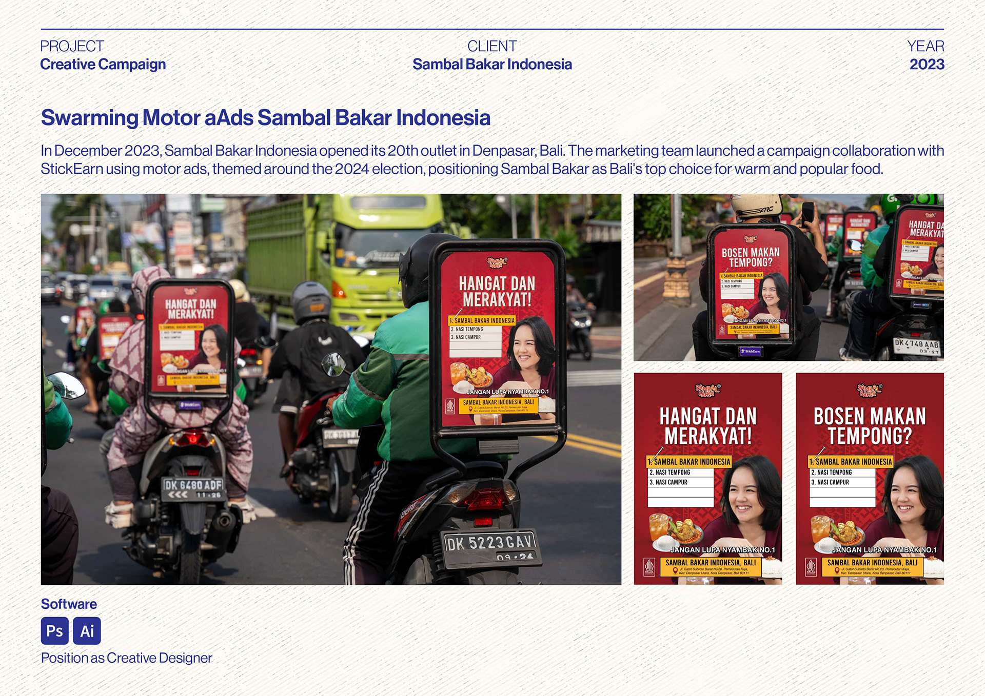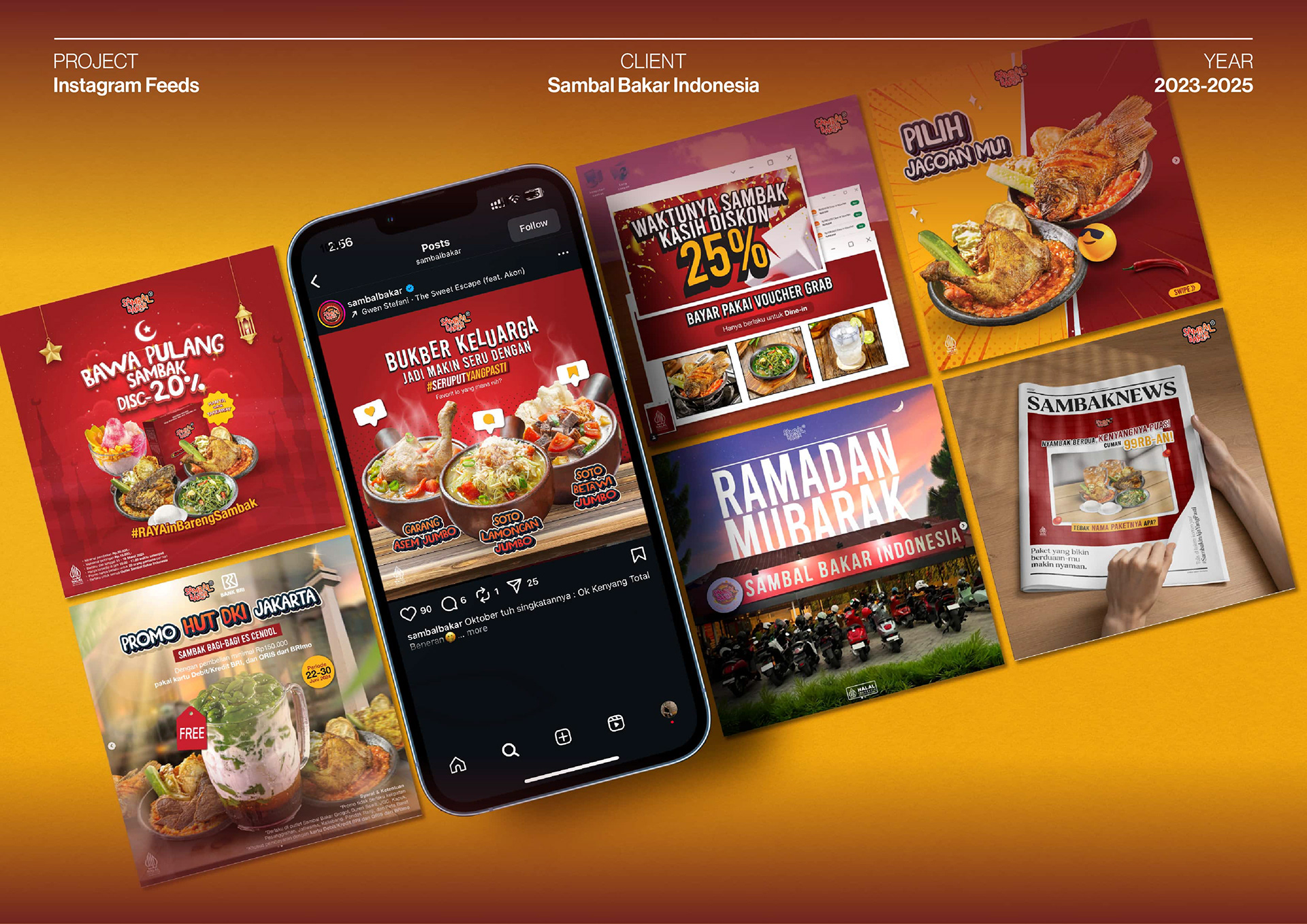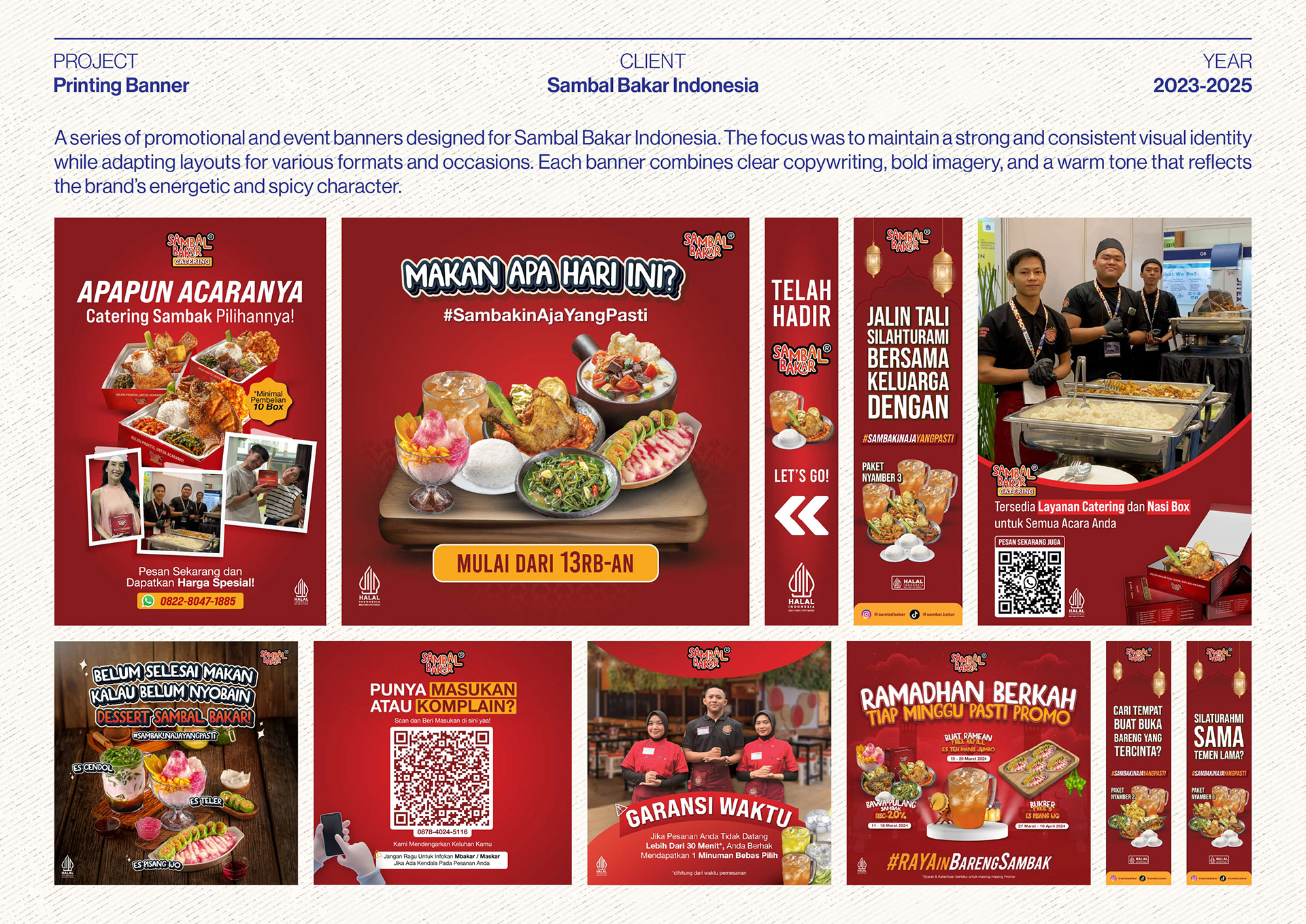 This motion graphic display was created for the re–grand opening of Sambal Bakar Indonesia Cibubur outlet, which had been temporarily closed due to a fire incident. The piece served as a welcome message video, played on the store’s TV display to greet customers and celebrate the reopening moment.