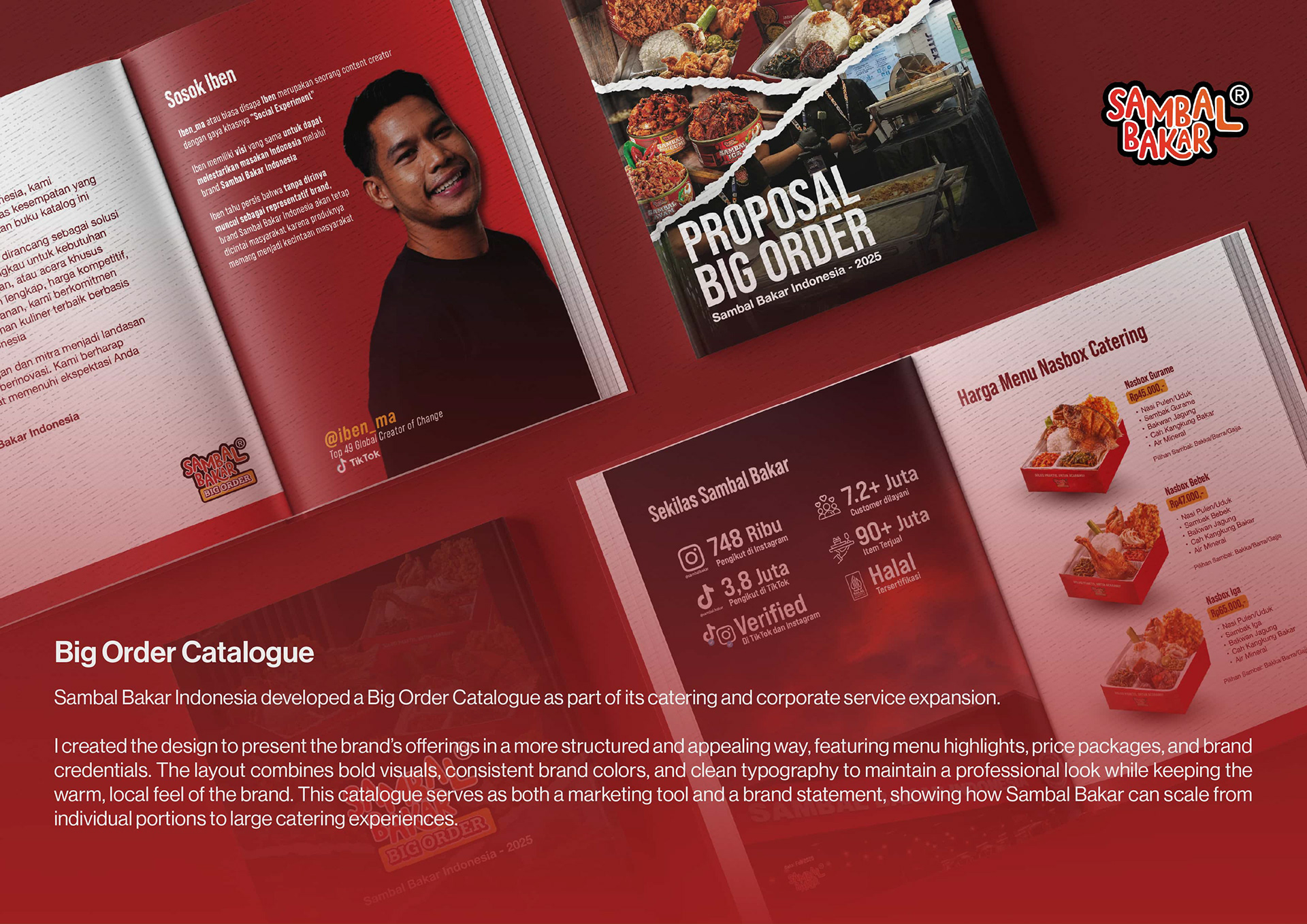 This display content promotes Sambal Bakar Indonesia’s catering and nasi box service, designed for corporate events, gatherings, and bulk orders. The visual direction focuses on practicality and warmth showcasing complete meal packages, delivery benefits, and bulk-order discounts to highlight the convenience and value of ordering in volume.