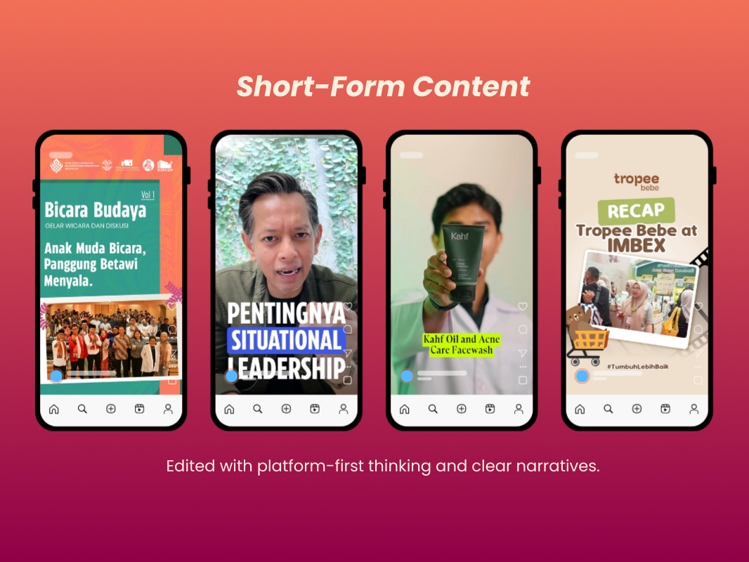 A curated set of social media videos edited for Ruangguru, tailored for fast-paced platforms and short attention spans. Each video is crafted with a focus on clarity, rhythm, and audience retention, while staying aligned with Ruangguru’s educational tone and brand guidelines.